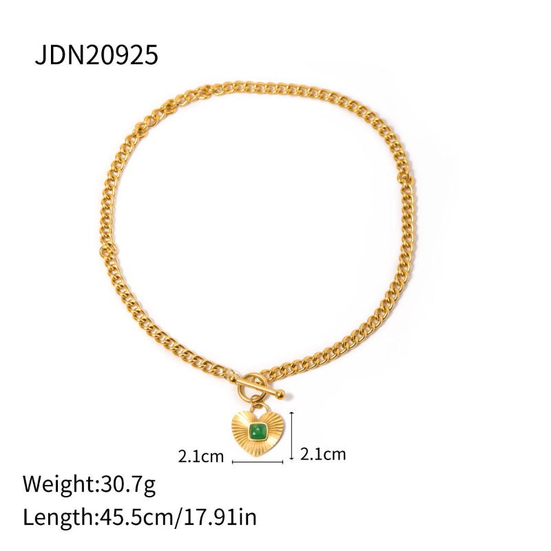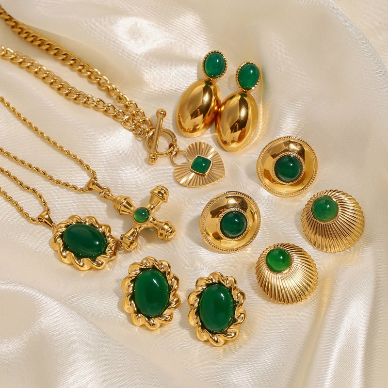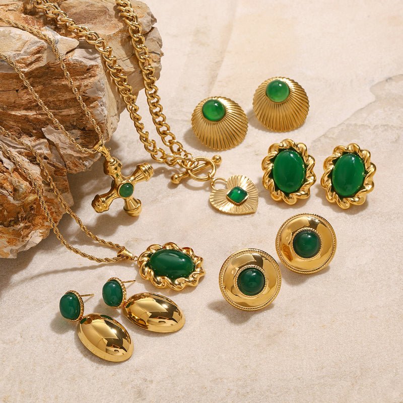 European American Stainless Steel Emerald Natural Stone Pendant Necklace Premium Vintage Stud Earrings Titanium Steel Jewelry Cross Border